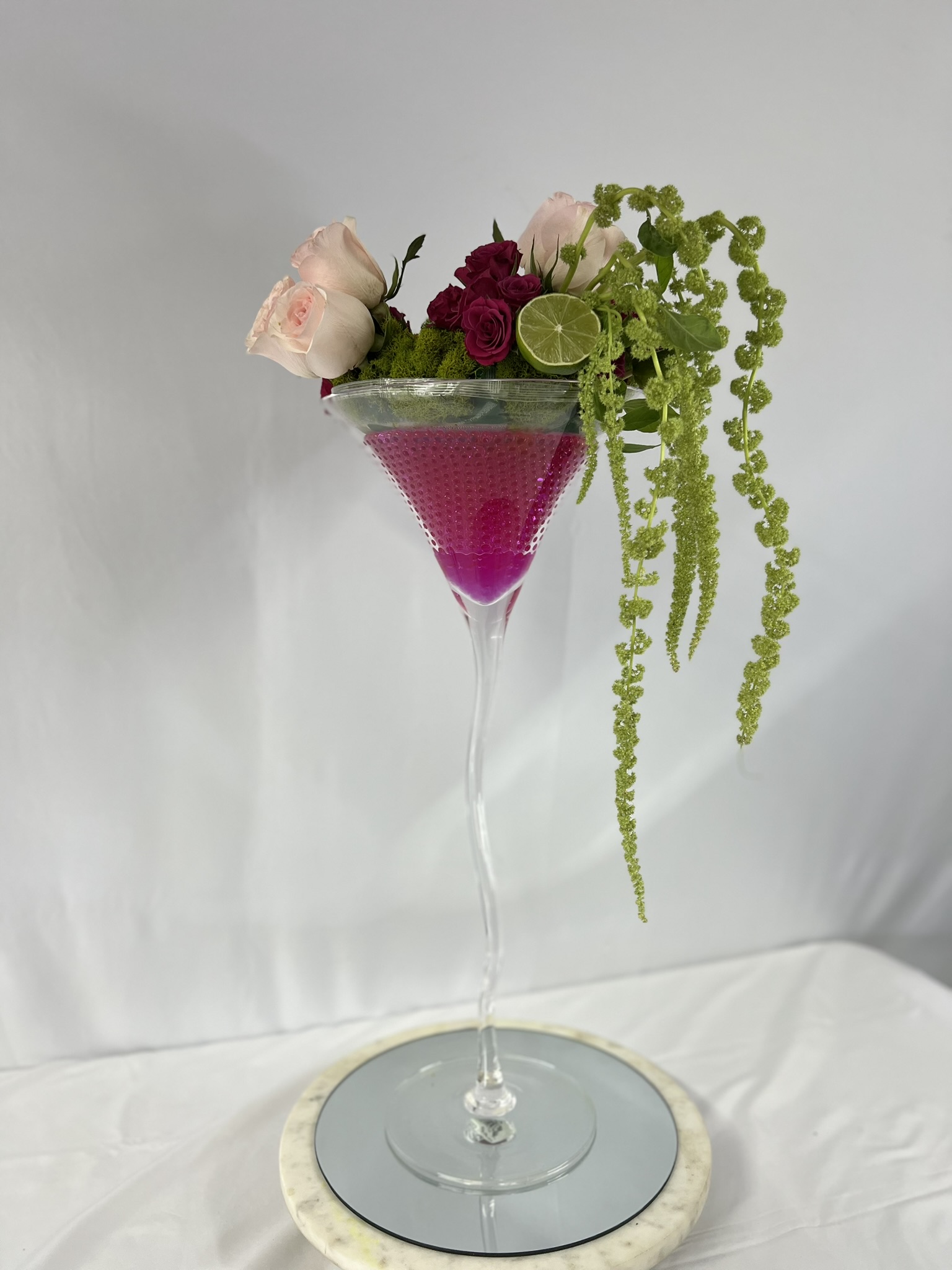 - The vibrant pink liquid in the glass completes the look, giving the illusion of a floral cocktail that’s as refreshing as it is luxurious.